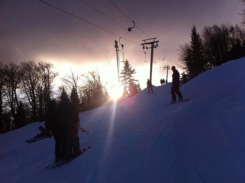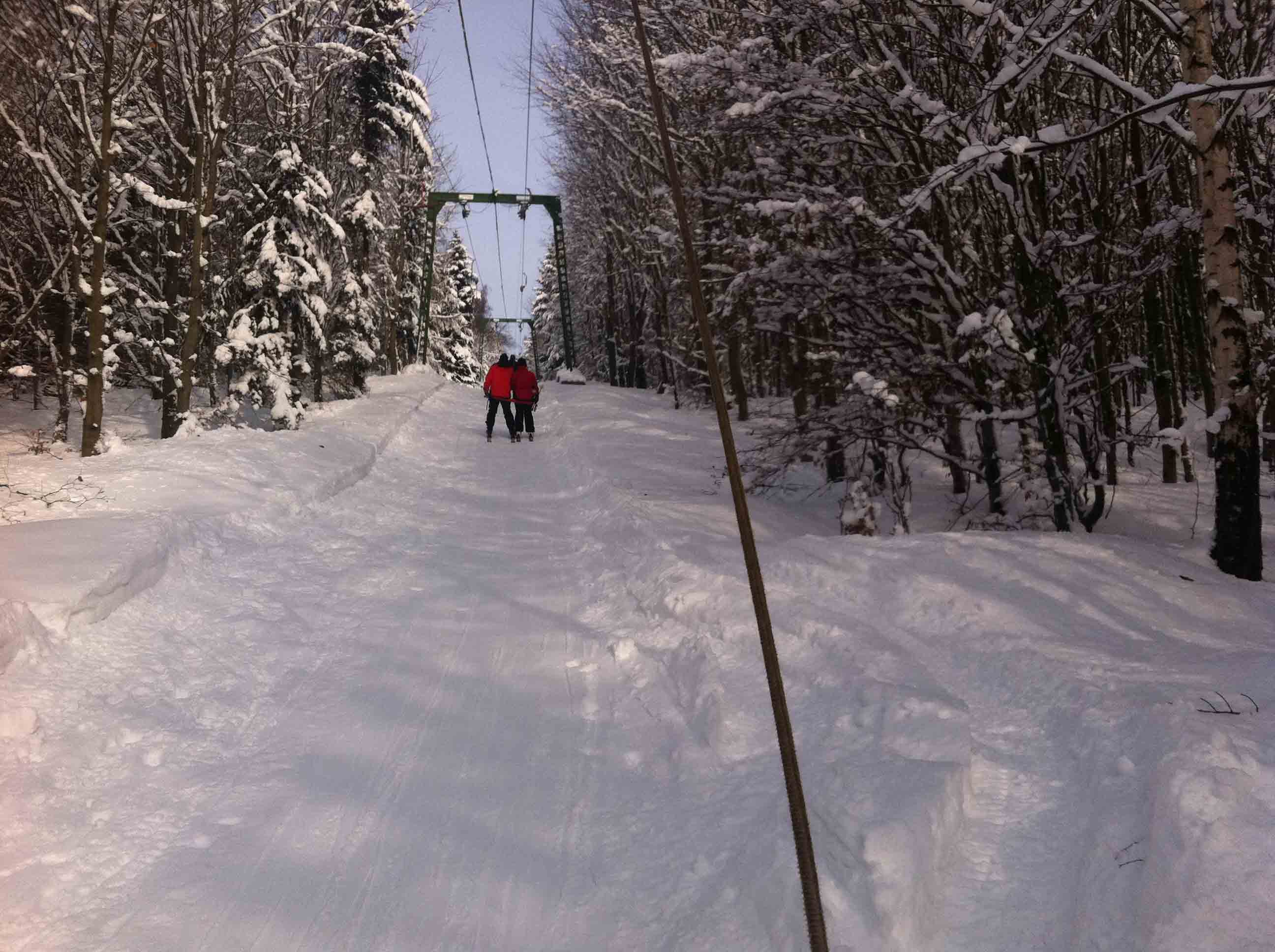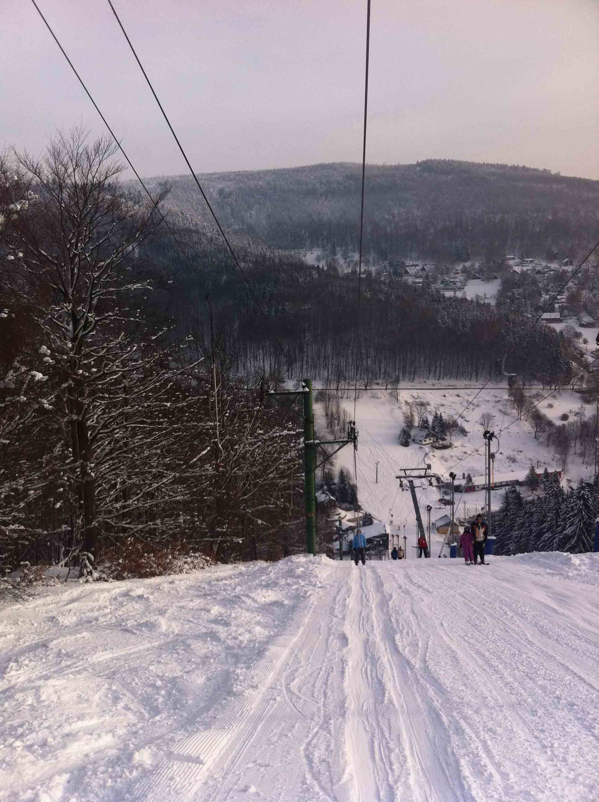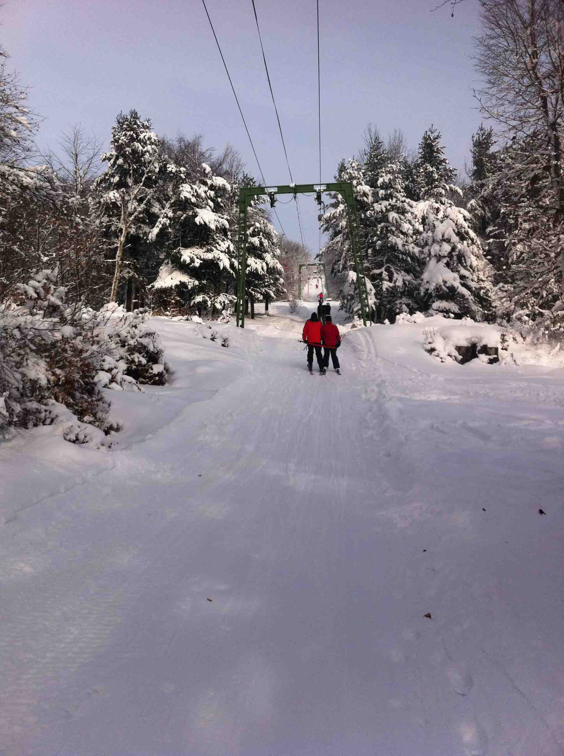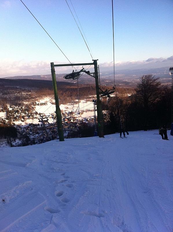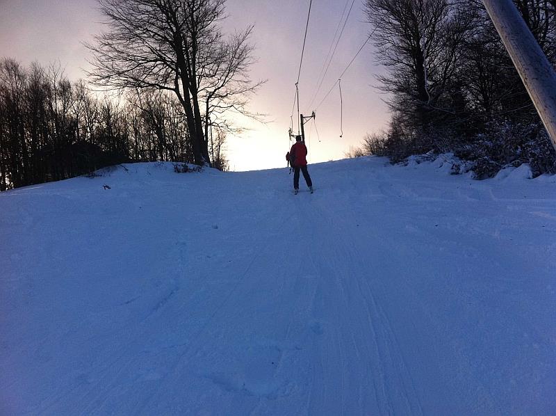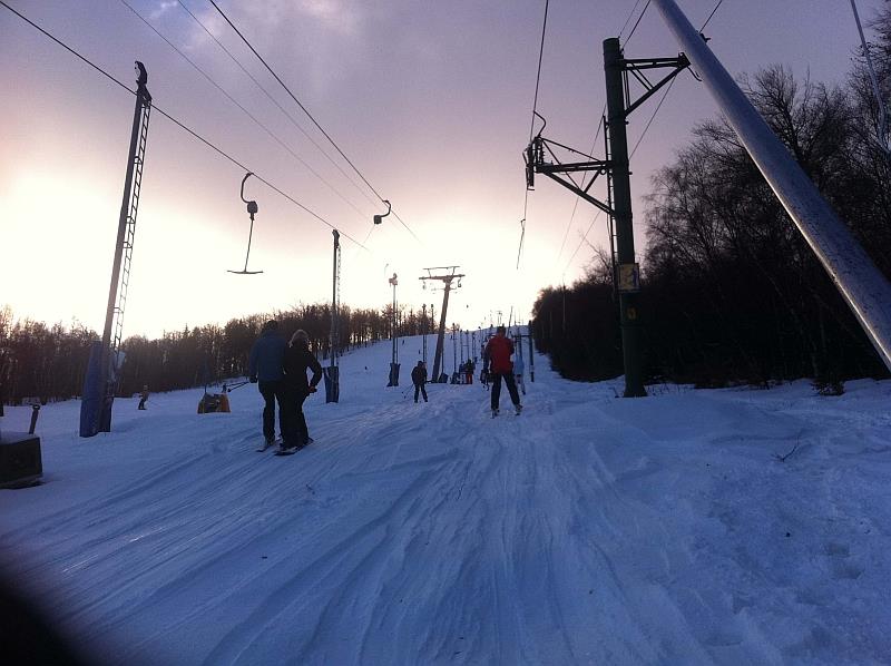 Ráno se jezdilo bez front nebo tak max 3 minuty. Samozřejmě nejdřív se rozjede jen Kotva, obsluhuje sjezdovky: Slalomák a neupravovanou freeride dvojku se super dřevěným skokánkem a převisem na sjezdovku tři. Na dvojce jezdí jen pár mladých