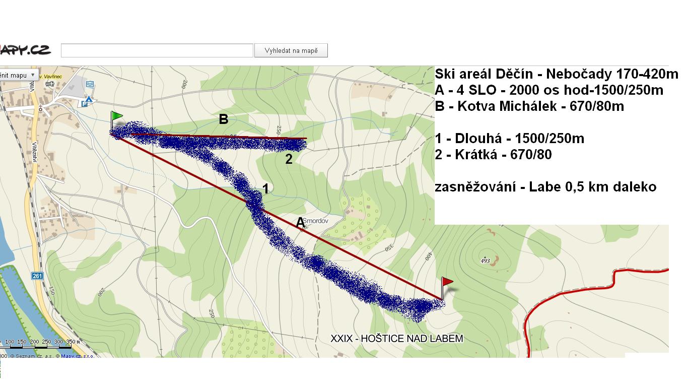 Jezdím pravidelně vlakem okolo Děčína a všimnul jsem si, že na jedné straně Labe jsou táhlé louky, které prakticky nepotřebují kácení (pár stromů tam bude, ale minimum) a sjezdovky tam prakticky jsou hotové, jen postavit zasněžování, lanovku, vlek, kiosek a záchody a může se jezdit. Nevýhoda je nízká nadmořská výška, ale zdroj vody je tam sakra silný (Labe), takže na zasněžení ideální a je to blízko 60 tisícového města a tudíž přímo hromadnou dopravou na sjezdovku. Tady jsem to nakreslil.
