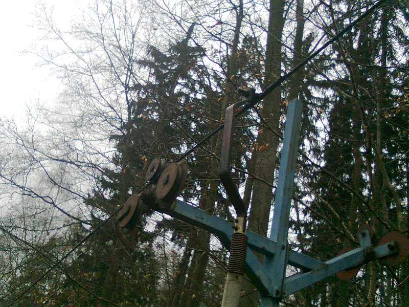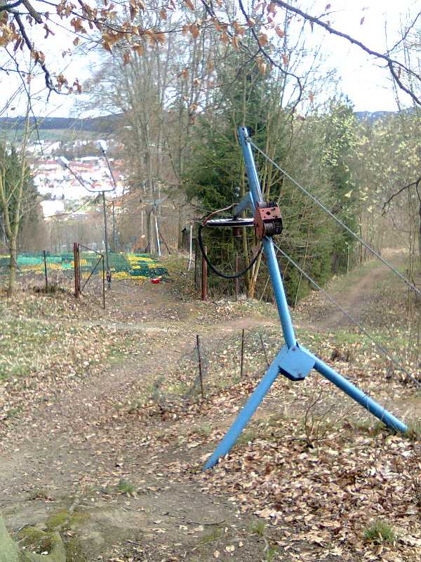 Poznámka: Na vratné větvi u předposlední podpěry chybí kladková baterie (zcizena či uhnila), lano je prověšené, unašeče se courají po zemi