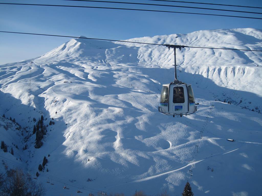 16-MGD Ruelle (Poma, 2000), vede z vesnice Hauteluce, kabiny mají mezi sebou poměrně velké intervaly a ve stanici vždy na nějakou dobu úplně zastaví
