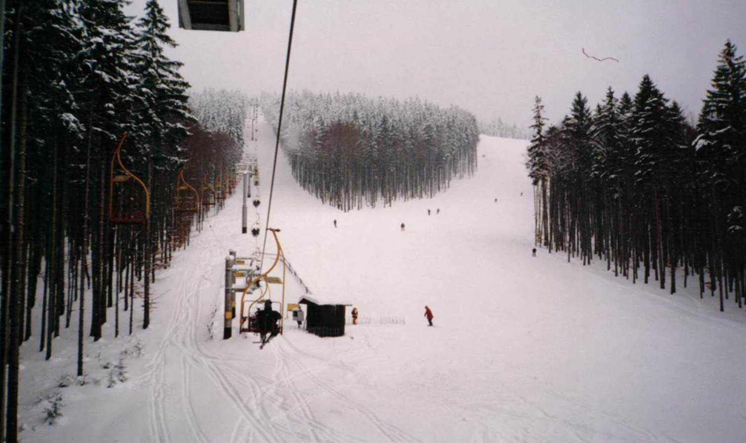 ve výrazně zalomené trase. Nalevo od tehdy výrazně užší sjezdovky Marguška II je patrný průsek zrušeného EPV, kdysi příležitostně provozovaného místní TJ.