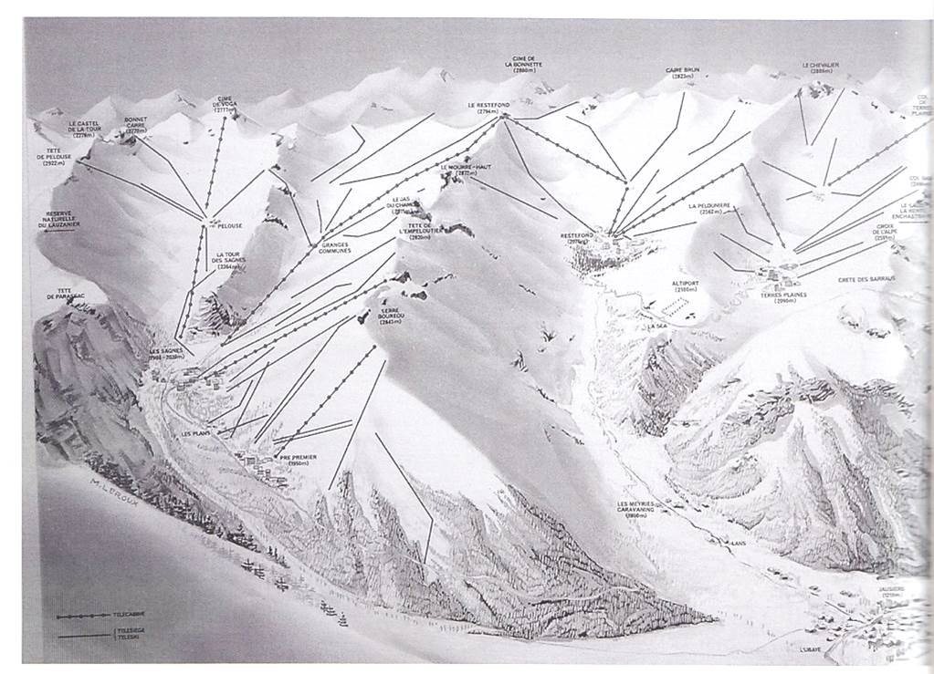 Na rozdíl od jiných francouzských megastředisek zůstal jen na papíře projekt Restefond u Jausiers v údolí Ubaye. Celkem 25 000 lyžařů zde mělo být ubytováno, aby využívali přes šedesát dopravních zařízení obsluhujících sjezdové tratě v nadmořské výšce 1900 – 2900 m. Nabízelo se i propojení se sousedním střediskem La Sauze. Realizace se nakonec dočkal až v roce 1982 jen malý areál La Frache poblíž obce se třemi na sebe navazujícími vleky od Pomy a 10 km sjezdových tratí. Pro ztrátovost a problémy s dodávkou elektřiny (nejvýše položený vlek vůbec nebyl v provozu) byl provoz střediska po 13 letech ukončen a vleky rozprodány do okolních areálů. Podle panoramatické mapy jsem se pokusil vyznačit polohu projektovaných vleků a lanovek.