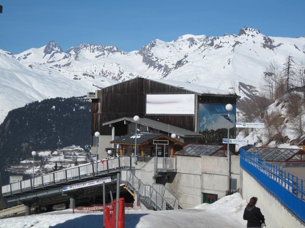 Pohled z opačné strany směrem na Les Coches, na fotce je vidět i lanovka Lonzagne, kterou se do areálu dostávají lyžaři z vesnice pod Vanoise expressem.